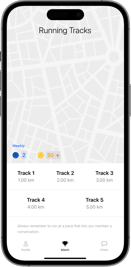 Choose from one of the five exciting tracks to run. Each track offers a unique distance and challenge. Match with a player who selects the same track and get ready for a fun and competitive run!