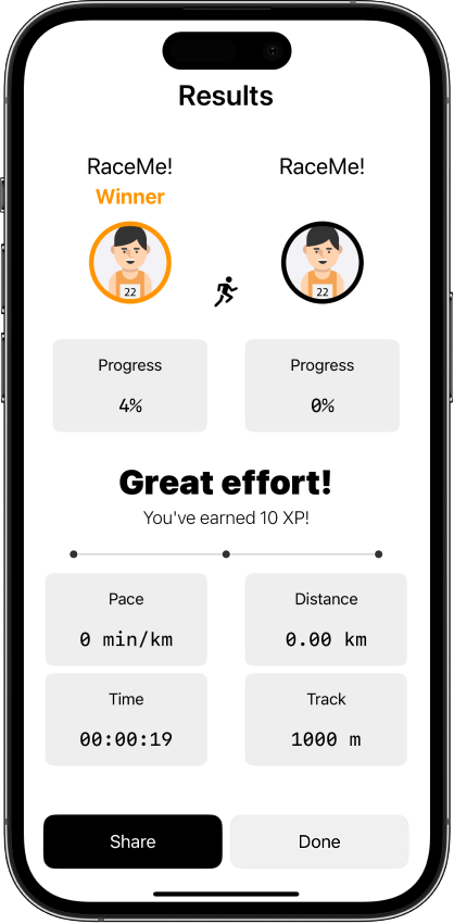 It's time to hit the track! Start running and compete with your opponent in real-time. Collect points, achieve milestones, and enjoy every step of your fitness journey!